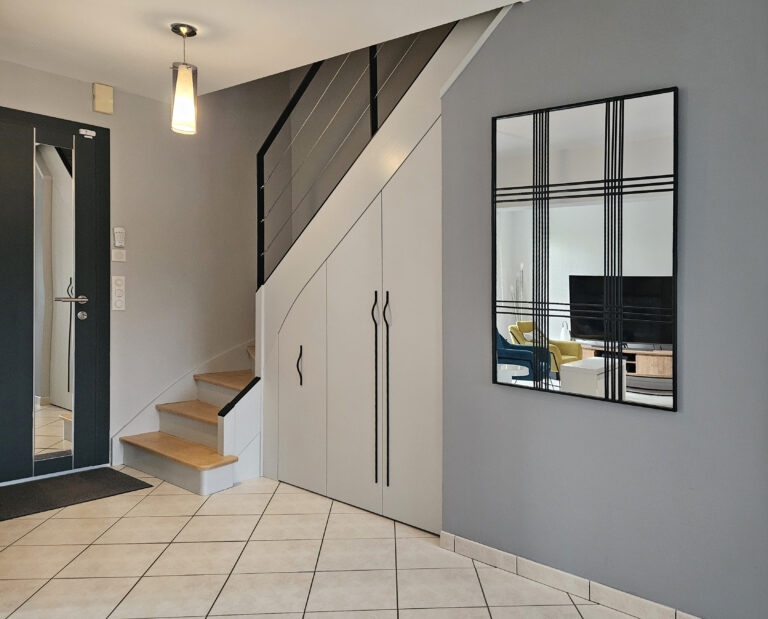 Selon vos envies, l’espace avec un aménagement sous escalier peut accueillir un rangement fonctionnel, une bibliothèque élégante, un coin bureau discret, un vestiaire d’entrée ou un espace décoratif mettant en valeur la structure de l’escalier.